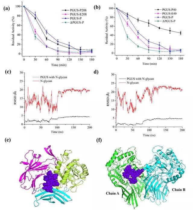 德赢AC米兰官网化学与化工学院李春教授课题组以前期完成晶体结构解析的真菌β-葡萄糖醛酸酶(PGUS,同源四聚体结构)为模型蛋白,并将其在毕赤酵母(能够在蛋白质的特定位点引入高甘露糖型糖链)中异源表达(PGUS-P),验证了蛋白质内源的Asn383和Asn594位点的糖基化对PGUS-P的稳定性有显著影响。通过计算机模拟与实验相结合的方法,揭示了PGUS-P的两个內源N-糖基功能类似于“连接臂”,能将空间上距离相近的超二级结构域相连,使得其局部结构更加紧凑,从而提高了蛋白质的整体稳定性。以此为启发,研究人员通过对PGUS的晶体结构分析,在超二级结构域、结构域、亚基界面间设计了N-糖基化位点,进一步提高了PGUS-P的动力学、热力学稳定性。酶学性质表征并结合全原子分子动力学模拟结果表明,在结构域界面间的Asn208位糖链和周围二个结构域产生的作用力,形成了“糖桥”构型,将蛋白质在70°C下的半衰期提高了2.7倍,去折叠自由能提高了8.4kJ/mol;而在亚基界面间的Asn40位糖链通过和相邻亚基的作用,形成了“糖卡”构型,将热稳定性提高了7.1倍,去折叠自由能提高了14.6kJ/mol,同时酶的催化效率也提高了1.7倍。