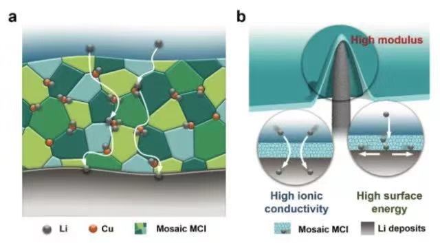 该团队通过化学液相反应法,在金属锂电极表面设计了具有高杨氏模量、快速离子传输特性的离子/电子混合导体界面层(Mixed conductor interphase,简称MCI)。MCI层作为固液界面层(Solid electrolyte interphase,SEI)和金属锂电极之间的过渡层,在具有高离子导率的同时兼顾一定的电子导率。