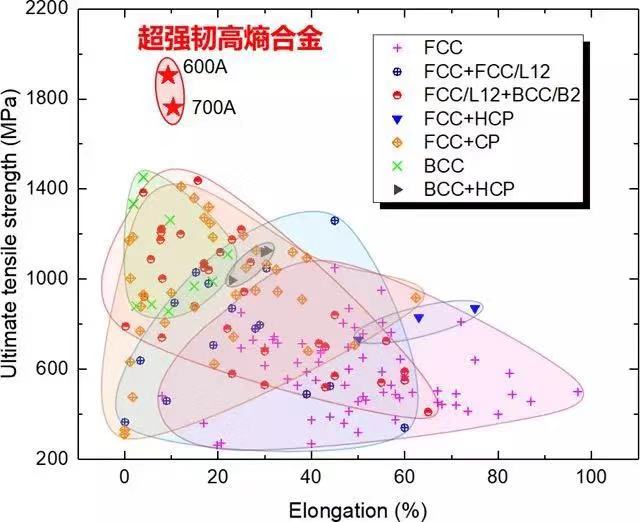 超强高熵合金与已报道高熵合金力学性能对比
