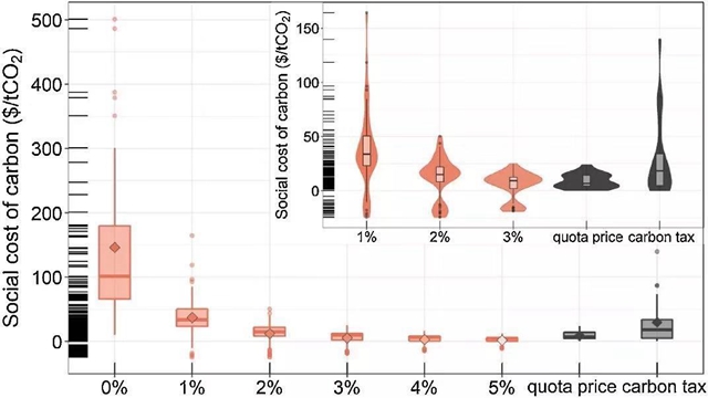 代际贴现率也是影响社会碳成本的关键因素,代际贴现率越大,对未来福利的折减越多,对应的社会碳成本越低。0%~5%的代际贴现率下,2020年社会碳成本呈现指数下降的趋势,平均值分别为146美元/吨CO₂,37美元/吨CO₂,12美元/吨CO₂,5美元/吨CO₂,3美元/吨CO₂,2美元/吨CO₂。在0%的代际贴现率下未来福利的变化对当期决策影响更大,得到的社会碳成本更高。同时,低贴现率放大了未来排放水平、温度和气候损失产生的不确定性,得到的社会排放成本最大值为501美元/吨CO₂,最小值为-25美元/吨CO₂,相比其他贴现率下的极差最大。
