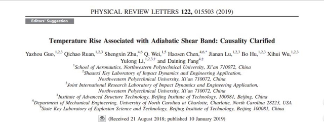 2019年1月11日,物理学顶级期刊《物理评论快报》(Physical Review Letters)在线报道了西北工业大学、德赢AC米兰官网(共同完成单位)联合研究成果。在方岱宁院士、李玉龙教授的指导下,郭亚洲副教授(第一作者)、陈浩森副教授(共同通讯作者)、朱盛鑫博士和阮启超硕士等开展了绝热剪切带的产生和温度之间的因果关系研究 (Temperature Rise Associated with Adiabatic Shear Band: Causality Clarified),这篇文章主编被选为“Editor’s Suggestion” 。
