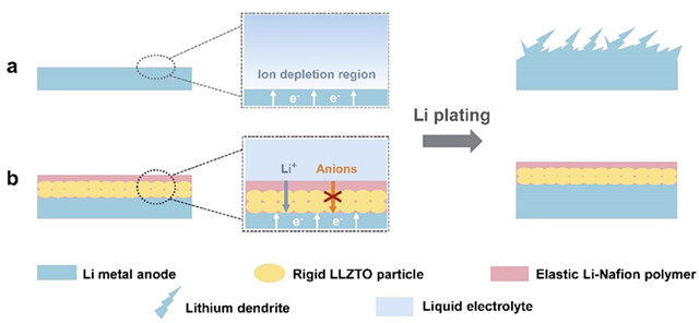该研究团队通过具有单离子传导特性的LLZTO和Nafion的复合,在电极表面构建了具有无机-有机双层构型的单离子保护层(LLN)。该保护层一方面可诱导锂离子在界面处的高效传输和均匀分布,防止离子耗竭的出现;另一方面双层构型结合了无机物的高模量与聚合物的柔性与形变性能,在电池循环中展现出优异的结构稳定性。二者协同效应共同促进了金属锂的无枝晶均匀沉积(图1)。