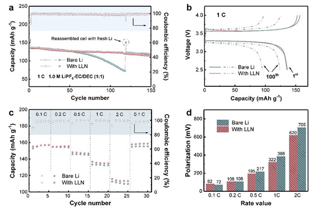 为探寻该保护膜的实用化意义,作者采用50 μm薄锂片(文献大量采用的锂片厚度为> 450 μm),在较苛刻条件下进行Li-LiFePO4全电池评测。电解液为无添加剂的1M LiPF6-EC/DEC碳酸酯电解液。在1 C倍率下,保护后的电池循环稳定性显著提升,150圈循环后仍保持120 mAh g-1的比容量。而无任何保护处理的对照组电池仅60圈后便发生容量的快速衰减。