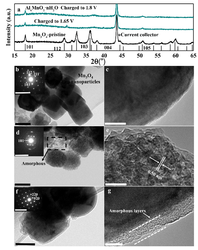 该研究团队设计了一种原位转化电化学反应来使得尖晶石型Mn3O4转化为含水的层状、无定形混合相AlxMnO2·nH2O的目的。为了验证该方法的可行性,采用电子能量损失法(EELS),X射线光电子分析以及透射电子显微镜-能量色散X射线光谱对反应产物的化学状态和元素种类进行了分析与表征。通过分析,电化学转化反应后Mn元素由2价/3价转化为4价。热重分析表明反应产物在50~300℃表现出更明显的质量下降趋势,表明在转化反应过程中结晶水的损失(图1)。通过以上一系列表征分析进一步证明了Mn3O4→AlxMnO2·nH2O原位转化反应的发生。