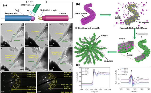 图1(a)原位TEM分析FeOOH电极的储钠过程中体积形变和储钠机理(b)多孔FeOOH纳米棒团簇的合成过程示意图(c)近边结构吸收光谱研究FeOOH的储钠机理