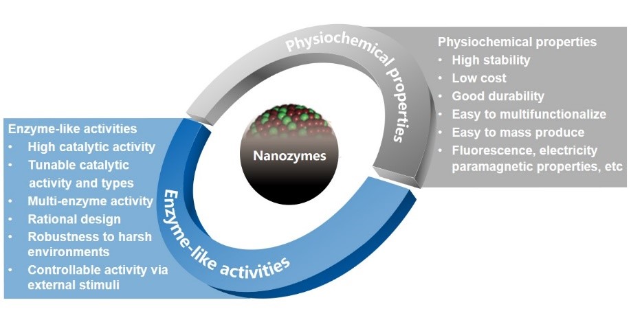 纳米酶是一类本身蕴含酶学特性的纳米材料,具有催化活性强、稳定性好、成本低等优势。自从2007年阎锡蕴院士团队首次报道纳米酶新概念以来(Nature Nanotechnology,2007),迄今,全球已有29个国家的290多个实验室报道了320余种纳米酶,逐渐形成了纳米酶新型交叉学科领域。纳米酶的出现是人工模拟酶研究领域的重大进展,它不仅揭示了惰性无机材料在纳米尺度呈现出不可预见的酶学特性,还使模拟酶研究领域从有机化学拓展到无机纳米材料领域。更重要的是,纳米酶克服了天然酶脆弱和昂贵的弊端,突破了以往模拟酶催化效率不高的局限性,目前已被广泛应用到疾病诊断和治疗、传染病防控、环境监测和污水处理等多个领域。纳米酶是目前为数不多的由中国科学家发现、被国际同行认可,并迅速实现成果转化的新型交叉学科领域。