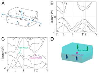 在前期工作基础上,姚裕贵/李翔研究团队进一步在国际先进的极端高压测量系统上开展实验研究工作,对Bi4Br4单晶的晶体结构和电子结构进行了更加全面系统的研究。如图1A所示,Bi4Br4在常压下的稳定相是α-Bi4Br4,具有各向异性的准一维链结构(空间群C2/m),其链内化学键较强,而链间范德华力较弱。因此压力可以在不引入化学掺杂复杂性的情况下,显著改变α-Bi4Br4原子间的排列方式和电子结构,从而引发多种常压下难以观察到的新奇物态。例如,理论预测具有相同C2/m对称性的另一种准一维β-Bi4Br4相(图1B),将在压力下实现弱拓扑绝缘体(WTI)-复合外尔半金属(Weyl Semimetal)-强拓扑绝缘体(STI)的转变。此外,另一个有趣的问题是:能否可以在高压下实现Bi4Br4的超导电性,同时保持它的拓扑态不变?为了从实验上解答这些问题,他们首先生长出了高质量的α-Bi4Br4单晶,并在0-45 GPa的准静水压范围内详细测量了其电阻随温度和磁场的依赖关系。如图2所示,他们在3.0-3.8 GPa之间观测到压力引起的绝缘体-金属转变;理论计算表明,这是由于价带和导带穿过费米能级,形成许多小的空穴和电子口袋造成的。有意思的是,随着压力的进一步增加,他们相继观察到两个超导转变(如图3所示)。其中第一个出现在3.8 GPa,电阻在6.8 K附近急剧下降至0,该转变温度随着磁场的增大而降低,并且高压磁化率显示出明显的抗磁信号。这些结果说明这是一个体相超导转变。继续增加压力,第一个超导相的转变温度逐渐降低,直至12 GPa以上完全消失;另一方面,在5.5 GPa、9.0 K附近出现第二个超导转变,其转变温度随着压力的增大而逐渐降低,但在45 GPa时仍然存在。为了阐明这些物性和结构的关系,他们利用X射线衍射(XRD)分别测量了Bi4Br4单晶和多晶在高压下的结构(如图4所示),发现在4.3 GPa时Bi4Br4保持单斜的α相结构,而在7.8 GPa时转变为三斜的P-1相。基于这些结果,他们又计算了α-Bi4Br4在压力下的能带结构(图5),从中可以看出其拓扑性在4.3 GPa时仍然受到C2旋转对称性的保护,表明第一个超导相可能与受旋转对称性保护的拓扑性共存;而第二个超导相的出现则与7.8 GPa发生的结构相变有关。上述结果对全面理解压力调控拓扑材料的晶体结构和电子特性具有重要意义。