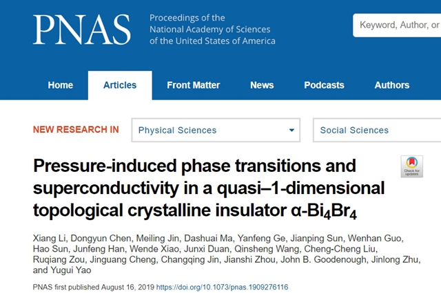 [1] Xiang Li, Dongyun Chen, Meiling Jin, Dashuai Ma, Yanfeng Ge, Jianping Sun, Wenhan Guo, Hao Sun, Junfeng Han, Wende Xiao, Junxi Duan, Qinsheng Wang, Cheng-Cheng Liu, Ruqiang Zou, Jinguang Cheng, Changqing Jin, Jianshi Zhou, John B. Goodenough, Jinlong Zhu, and Yugui Yao; “Pressure-induced phase transitions and superconductivity in a quasi–1-dimensional topological crystalline insulator α-Bi4Br4”, PNAS, 1909276116 (2019).