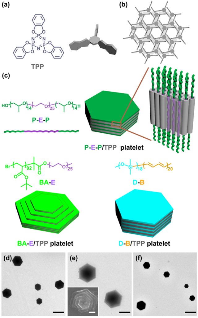 鉴于此,我校材料学院罗运军-李霄羽课题组提出了利用主体分子三邻苯二氧基环三磷腈(TPP)和嵌段聚合物客体分子共组装制备二维片层结构组装体的新方法。其中,主体分子的晶体结构决定了片层组装体的形貌,因此该方法极大地丰富了嵌段聚合物的选择。