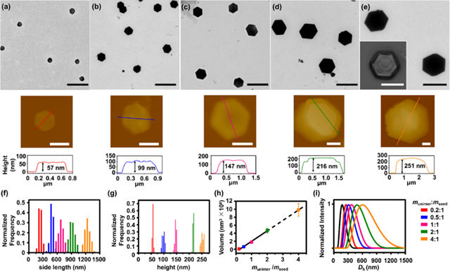 选择其中一种嵌段聚合物和TPP组装成的六边形片层结构,作者利用“籽晶生长法”,对其溶液进行超声破碎得到较小的扁球形片层结构,再以之核,加入新的嵌段聚合物和TPP进行生长,最终形成尺寸均一的六边形片层结构。