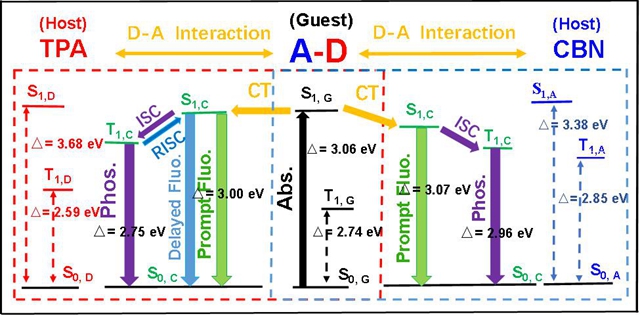 图2 TPA/DOB和CBN/DOB掺杂材料的Jablonski图。S1,D和T1,D表示TPA的单重态和三重态,S1,A和T1,A表示CBN的单重态和三重态,S1,G和T1,G表示客体分子(DOB ),S1,C和T1,C表示主体分子和客体分子之间形成的电荷转移状态的单重态和三重态。(图片来自于ACS)