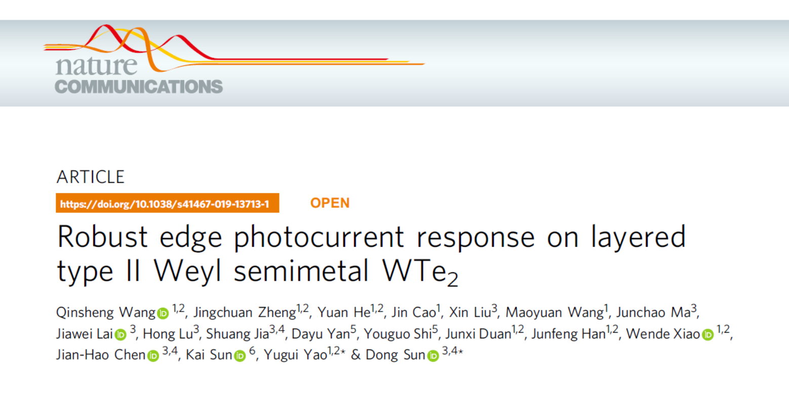 近日,德赢AC米兰官网物理学院姚裕贵教授、王钦生特别副研究员及团队成员,同北京大学量子材料中心孙栋研究员等合作者,在第二类外尔半金属材料WTe2光电响应研究方面取得重要进展。他们利用扫描光电流谱方法对第二类外尔半金属材料WTe2光电响应进行了系统的研究,发现在该材料边界处具有反常的光电流响应(图1),并且边界对称性的高低决定了该反常光电流响应的有无。该工作提出了利用材料低对称性边界的晶体场作为光生电子-空穴对分离的有效手段,并讨论了拓扑边缘态对于光电响应的可能影响,为拓扑半金属材料在光电探测等方面的应用提供了新的思路。相关成果最近发表在Nature Communications上。