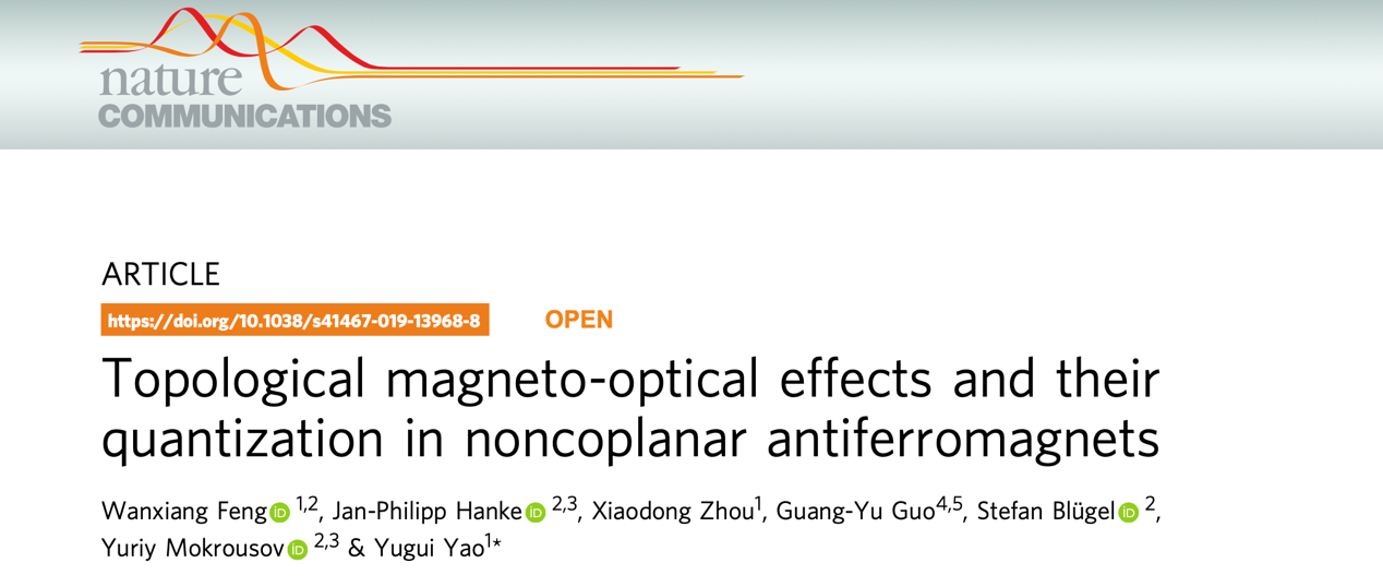 [1] Wanxiang Feng, Jan-Philipp Hanke, Xiaodong Zhou, Guang-Yu Guo, Stefan Blugel, Yuriy Mokrousov, and Yugui Yao. “Topological magneto-optical effects and their quantization in noncoplanar antiferromagnets”. Nature Communications 11, 118 (2020)。