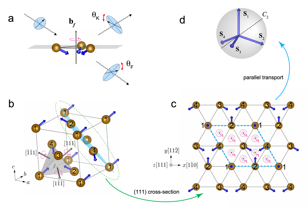 图1 (a)标量自旋手性诱导的拓扑磁光效应。(b)三维面心立方晶格中的非共面反铁磁自旋结构。(c)二维三角晶格中的非共面反铁磁自旋结构。(d)四个非共面的自旋经过平行输运后形成的单位球。