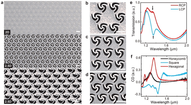 图2 实验制备的立体超表面及其增强圆二色特性。