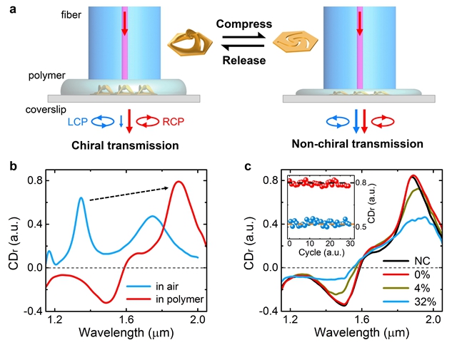 光频波段三维超材料和二维超表面的动态调谐是该领域器件应用面临的障碍之一。该报道的立体超表面拥有新颖的三维扭曲形貌和可逆形变特性,具备动态调控的潜能。为此,合作团队利用单模光纤反复压缩和释放立体超表面,在实验上实现了近红外波段圆二色性的片上可逆调谐,为立体超表面在力、热、光、电、磁、声等领域的动态调控应用提供了重要的技术参考。