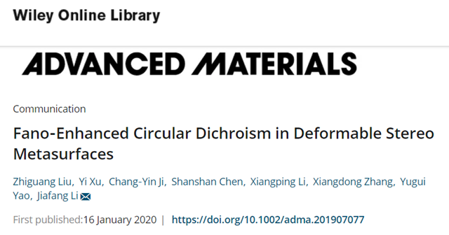 文章信息:Zhiguang Liu#, Yi Xu#, Chang-Yin Ji#, Shanshan Chen, Xiangping Li, Xiangdong Zhang, Yugui Yao, and Jiafang Li*, “Fano-enhanced circular dichroism in deformable stereo metasurfaces”, Advanced Materials 32, 1907077 (2020). (#为共同一作;*为通讯作者)
