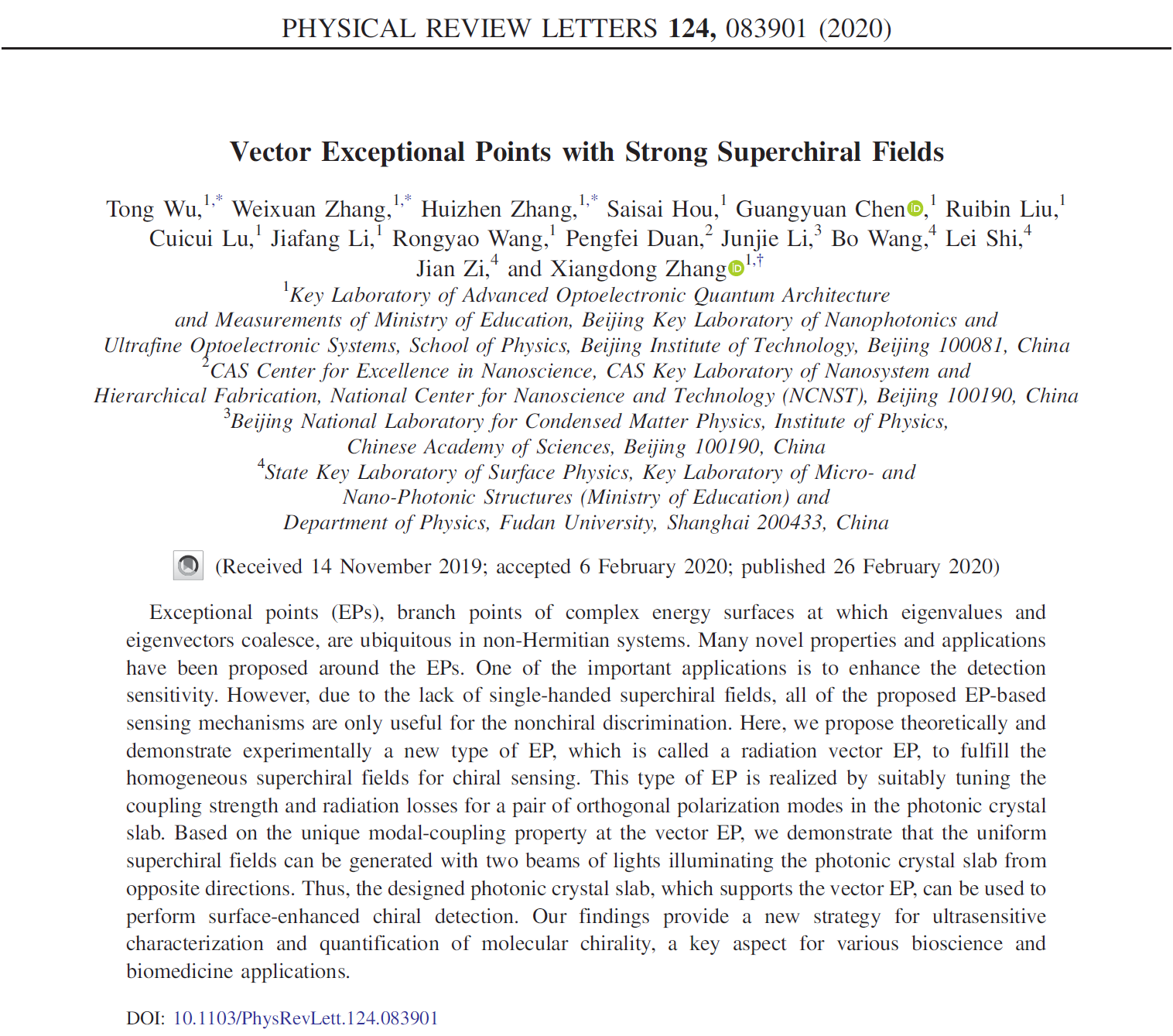 该工作发表于物理学顶级期刊《Physical Review Letters》:Tong Wu#, Weixuan Zhang#, Huizhen Zhang#, Saisai Hou, Guangyuan Chen, Ruibin Liu, Cuicui Lu, Jiafang Li, Rongyao Wang, Pengfei Duan, Junjie Li, Bo Wang, Lei Shi, Jian Zi, and Xiangdong Zhang*,“Vector Exceptional Points with Strong Superchiral Fields”,Physical Review Letters 124, 083901 (2020); 文章链接:https://link.aps.org/doi/10.1103/PhysRevLett.124.083901