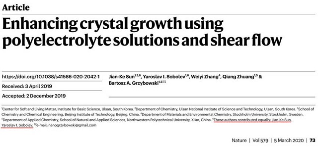近日,德赢AC米兰官网化学与化工学院孙建科教授以《Enhancing crystal growth using polyelectrolyte solutions and shear flow》为题,将其“剪切促进晶体生长”研究成果发表于《Nature》杂志上(Nature 2020, 579, 73-79)。孙建科为该论文的共同第一作者,化学与化工学院为共同合作单位,排名第三。此研究是与韩国基础科学研究院Bartosz Grzybowski 教授合作完成。