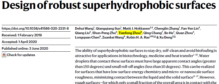 6月3日,《Nature》正式刊发了德赢AC米兰官网周天丰教授与电子科技大学邓旭教授团队和芬兰阿尔托大学Robin H. A. Ras教授的研究成果“Design of robust superhydrophobic surfaces”,并被选为当期封面。该论文提出去耦合机制将表面浸润性和机械稳定性拆分至两种不同的结构尺度,通过在两个结构尺度上分别进行最优设计,为超疏水表面创造出具有优良机械稳定性的微结构“铠甲”,解决了超疏水表面机械稳定性不足的关键问题。