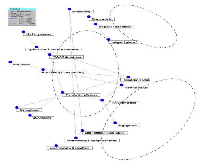 上图为本项目研究中基于NEDD检索策略所获取的61,465条记录(2000年至2012年),经过数据清洗、字段合并、自然语言处理、聚类等一系列分析处理方法,将其中前500个高频词聚为19类。图中每个节点代表NEDD中一个主要研究领域,例如RNA interference(RNA干扰),DNA vaccine(DNA疫苗)等。图中的连线代表研究领域之间的关系:连线越短代表两个领域间的联系越紧密。例如Quantum Dot(量子点)与Magnetic nanoparticle(磁性纳米粒子)在图中的距离很近,代表这两部分的研究有很大的相关性。该项研究建立了一个成体系的分析模型,从而可以辅助预测新型技术的创新路径,为深入开展NEDD研究,并推进其向更广泛、更多样的领域拓展奠定了基础。