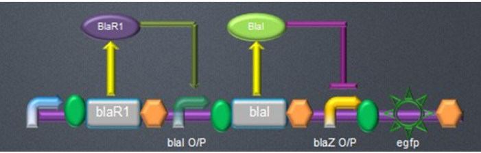 下图为BIT代表队设计的β内酰胺传感器的示意图。图中,BlaR1为可与β内酰胺特异性结合的膜蛋白,BlaI为BlaZ启动子的抑制子。当BlaR1与β内酰胺结合时,将启动BlaI的降解机制,从而打开BlaZ启动子,开启下游增强型绿色荧光蛋白的表达。