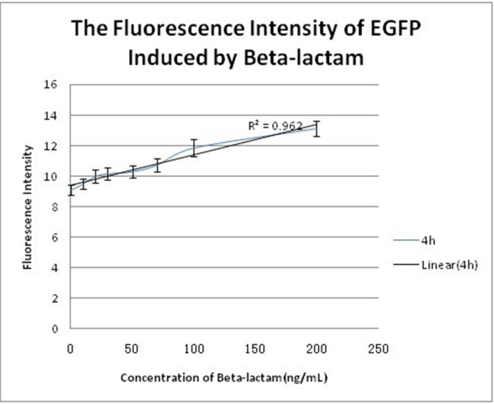 如下图所示,工程菌荧光表达强度与β内酰胺浓度之间呈现出良好的线性关系,即实现了绿色荧光蛋白速率和数量的可控表达。