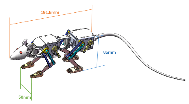 本项目机器鼠全身共12个主动自由度(腰部2个,单腿2个,头部2个),4个足端被动自由度,机器鼠鼠长度200mm(无尾),宽度为50mm,总重量358g(包括电气部件),实现了高度的集成化和轻量化设计。