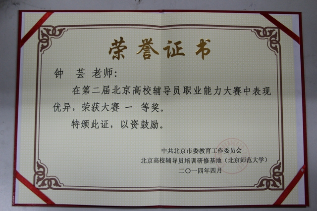 前期经过北京各高校初选,来自30余所高校的20名辅导员进入本次决赛。此次比赛共设院校推荐、笔试选拔、现场决赛等三个阶段,其中决赛通过主题班会、主题演讲、案例分析、谈心谈话情景再现等四个环节,全面考察辅导员的各项工作能力。在主题演讲环节,钟芸老师凭借深刻的内容、优美的语言和极具感染力的表达,获得了评委们的肯定。在谈话谈话情景再现环节中,钟芸老师抽到的题目是“如何处理学生酒后打架的矛盾”,钟芸老师充分展现了一名辅导员的职业素质,有条理地帮助学生分析问题并解决了矛盾。最终凭借四个环节的综合表现,取得了优异的成绩。