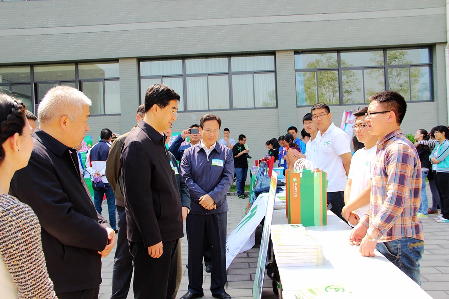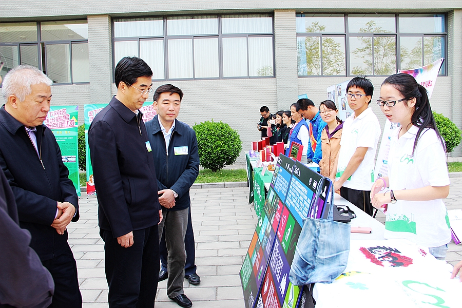 随后,秦宜智来到我校生命学院生态科考团展台前,同学们热情地向秦书记介绍了通过参与生态科考、将科考成果和亲历感悟编撰而成的《亲历科考 感悟生命》、《校园植物志》和《大自然的守望者》3册图书,以及自己的收获。接着,秦宜智来到我校绿萌资源与环境保护协会展台前,一边倾听同学们介绍开展的春季植树、再生纸缘、变废为宝、环教进小学等环保活动,一边翻看社团环保活动的“小成果”(环保袋、树叶书签、卡贴等),与同学们亲切地交流,秦宜智对我校两个环保社团开展的活动表示了充分的肯定,希望同学们在继续开展好生态科考、春季植树等活动的基础上,将环保理念向周围的广大同学、社区居民和小学生等群体传递,通过大家的努力提高全社会的环保意识。