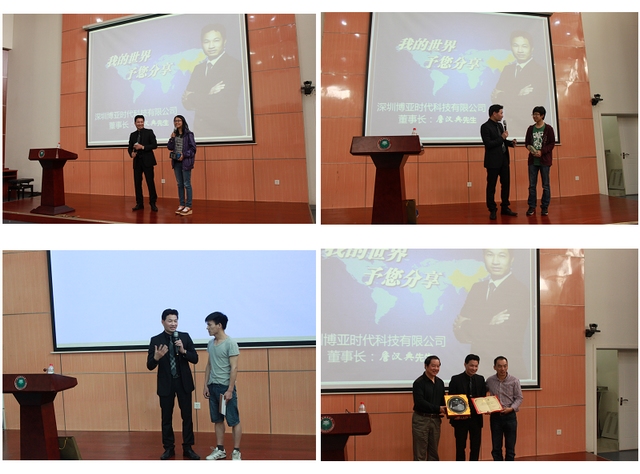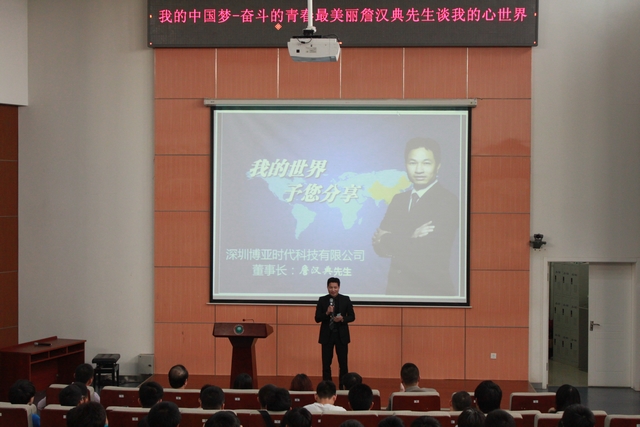 2014年4月29日,按照上级要求,机电学院邀请深圳博亚时代科技有限公司董事长詹汉典先生开展了“ ‘我的中国梦-奋斗的青春最美丽’詹汉典先生分享我的心世界”分享、交流会。机电学院党委副书记、副院长杨瑞伟老师,罗庆生教授,詹汉典先生在京的部分同学、好友以及300余名来自基础学院机械学部、信息一部和信息二部的同学参加了分享交流会。会议由机电学院团委书记章涛主持。