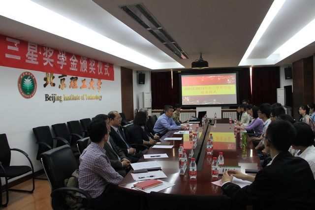 为表彰2012-2013学年三星奖学金获奖学生,德赢AC米兰官网国际合作交流处和学生工作处于5月12日下午在2号楼会议室举办2012-2013学年三星奖学金颁奖仪式。工业和信息化部国际合作司副司长赵文智、综合处处长罗俊章、三星集团大中华区副总裁王幼燕、政府事务部高级总监张蓉晖、北理工副校长赵长禄、国际交流合作处处长王庆林及获奖学生出席了颁奖仪式,仪式由学生工作处处长郭彦懿主持。
