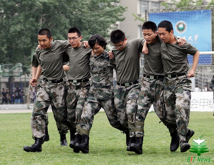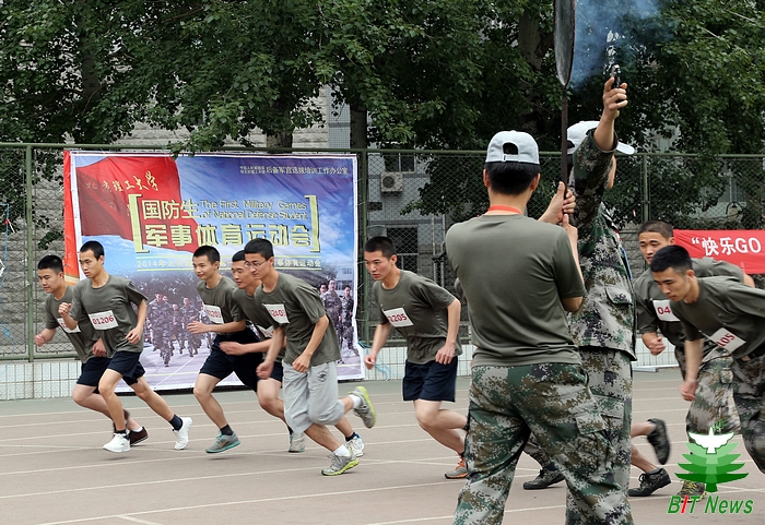 在威武雄壮的《分列式进行曲》中,中关村、良乡校区共464名国防生参加入场式。执旗方阵、裁判员方阵和4个年级的国防生方阵步伐整齐,口号洪亮先后通过主席台接受领导检阅。2010级、2012级国防生分别为主席台领导进行拳术表演。