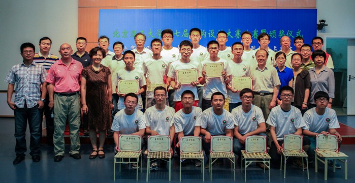 通过紧张激烈的比赛,最后决出获得特等奖、一等奖、二等奖和三等奖的7组选手以及获得 “最佳造型奖”、“最佳制作奖”、和“功败垂成奖”的3组选手。 “最佳结构分析奖”待评委会另行组织答辩后确定。教务处副处长曹峰梅、实设处副处长彭少春、校团委学术科技部部长尚松田、宇航学院党委副书记副院长肖雄分别为参赛选手颁奖,并合影。