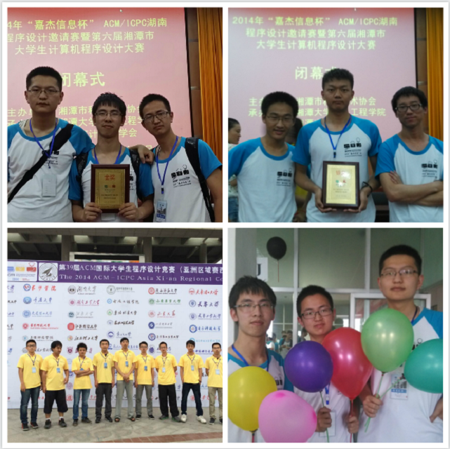 2014年ACM/ICPC亚洲赛区邀请赛于5月正式开赛。德赢AC米兰官网软件科技创新创业基地派出5支队伍参加各大赛区的邀请赛。其中湖南程序设计邀请赛于2014年5月31日在湖南湘潭大学举行,本科2012级的潘虹宇、贾容千和2013级的宦成颖同学组成的“akemi_Death_last”队伍在比赛中获得全场第四名,摘得金牌。此外,由申震等组成的“Acity”队伍和刘明汉等组成的“2Bpencil”队分别在湖南邀请塞和西安邀请赛中取得了一枚银牌和一枚铜牌的优秀成绩。
