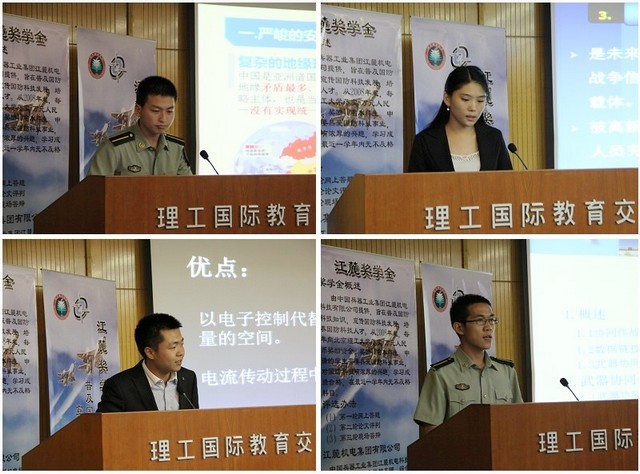 在主持人介绍了本届奖学金评选流程及今日答辩安排后,从前两轮角逐中脱颖而出的14位入围最终答辩环节的选手逐一登场,以当代大学生的视角就国防科技的奇思妙想或当前国防热点问题进行答辩陈述。陈述内容涉及无人机技术、新概念武器、巡航导弹等方方面面,选手们新颖的选材、独特的视角、严谨的逻辑、敏捷的思维令评委大加称赞。三个多小时的答辩精彩纷呈、亮点频出,评委与选手的互动问答环节更是让现场掌声雷动。