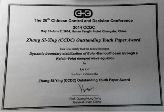5月31日,第26届中国控制与决策年会(CCDC)在湖南长沙举行。由我院王军民教授指导的芦璐同学的论文获得了该年会的最高奖项——“张嗣瀛青年杰出论文奖”,论文题目为《Dynamic boundary stabilization of Euler-Bernoulli beam through a Kelvin-Voigt damped wave equation》。