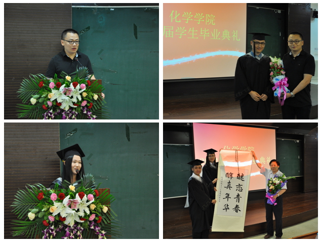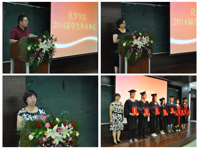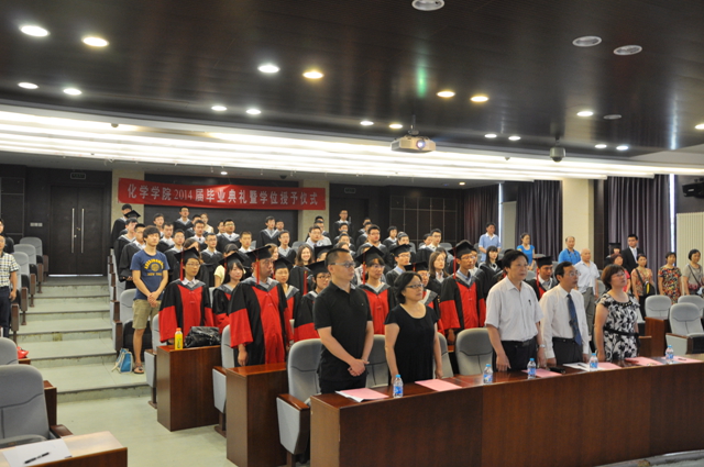 7月1日,化学学院2014届毕业典礼暨学位授予仪式在研究生楼101报告厅隆重举行,典礼由分党委副书记、副院长栗兴老师主持,学院院长胡长文教授、分党委书记赵文祥教授、副院长张小玲教授、副院长支俊格教授、教师代表王博教授、部分学生家属和全体毕业生出席典礼。