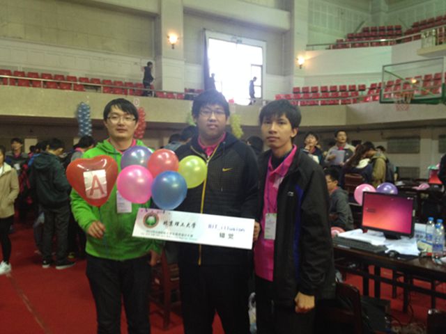 2014年10月12号上午9点,牡丹江现场赛正式开始。我校BIT_illusion队在开场5分钟便一次通过了A题,成为全场第一个通过题目的队伍,跃居榜首。BIT_illusion队三位队员依靠长久积累的编程经验以及大局观,一路领先,最终通过6题,力压北京大学、复旦大学、哈尔滨工业大学和中山大学获得季军,连续三年杀入世界总决赛!