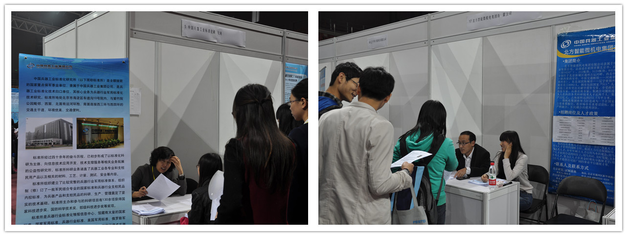 2014年10月20日,我校在体育馆主馆举办了中国兵器工业集团专场招聘会。中国北方工业公司、中国北方车辆研究所、中国兵器工业标准化研究所、中国北方发动机研究所、北方夜视科技集团有限公司、西北工业集团有限公司等56家中国兵器工业集团下属单位前来参会,吸引约3000名校内外学生到场应聘。