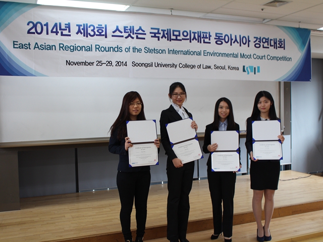 2014年11月25-29日,第19届国际环境法模拟法庭大赛(International Environmental Moot Court Competition, IEMCC)东亚地区选拔赛在韩国首尔举行。由法学院张艳丽副院长、环境法所所长罗丽教授、张晏老师带领的2011级学生张晗、张航、王蔚、王安琪、蔡文组成的德赢AC米兰官网代表队参加了此次竞赛,并取得优异成绩,王蔚同学以出色表现获得“最佳辩手”的奖项。