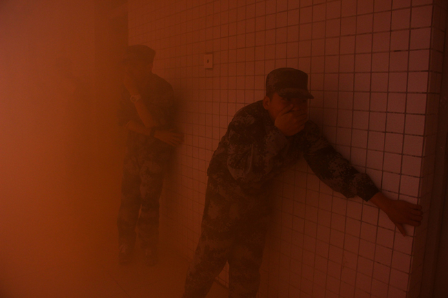 橙黄色的浓烟从阳台冒出,警哨声、脚步声、呼喊声交织一起,学生们纷纷拿着湿毛巾捂着口鼻,井然有序地迅速冲下宿舍楼……3月16日,我校珠海学院6378名军训学生参加演习。