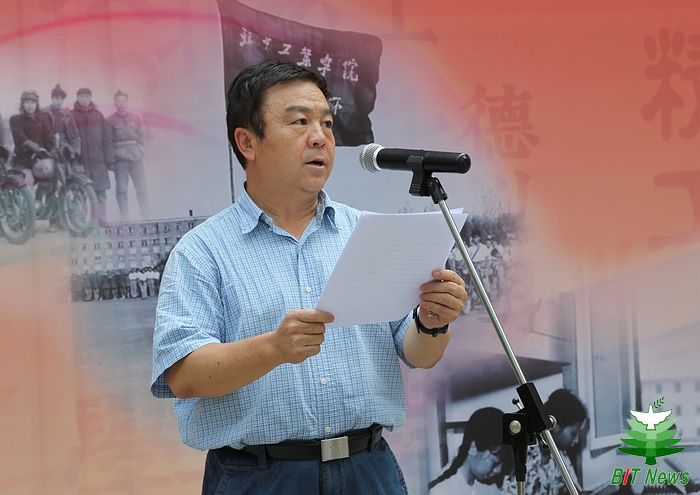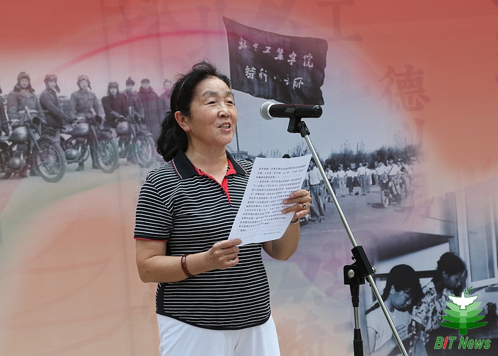 离退休教职工党委委员郭景华代表离退休教职工发言,她深情回顾了北京工业学院时期的发展历史,她讲到离退休教职工们都亲身经历了从“京工人”到“北理工人”的巨大改变,为学校始终在国家发展、国防建设方面做出的贡献感到自豪,为秉承“延安根、军工魂”,传承北理工精神而感到光荣。