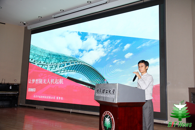 田刚印以故事的形式,通过寻梦北理,筑梦中国,寻根母校三部分内容分享自己的经历,从对“飞”的热情启程,从20平米的“开间”起家,到世界首架电控共轴无人直升机研发成功,他真诚的告诫在座同学,人生道路会出现各种利益诱惑,只有坚定信念,抛弃杂念,始终向着一个方向坚持不懈,才能距离梦想更近一步。