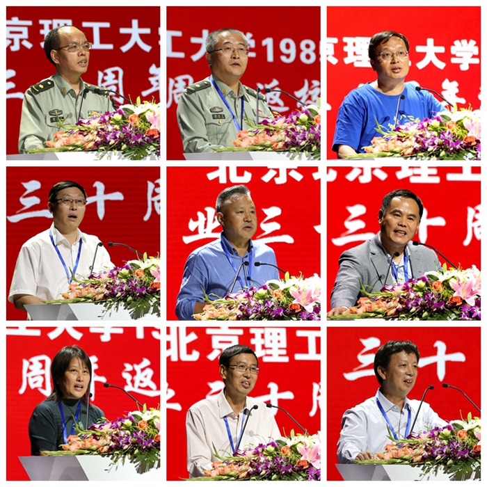 第二炮兵装备研究院副总师、16811班麻永平校友,军事交通学院教授、22811班苏欣平校友,国家发展改革委经济与国防协调发展司司长、 32811班王树年校友,九城网络技术集团有限公司CEO、42811班王双校友,电子科技大学集成电路研究中心主任、教授、博导,成都十大杰出青年、54811班张波校友,技源科技(中国)有限公司董事长兼CEO、62811班周京石校友,机科发展科技股份有限公司自动检测与装备事业部总经理、全国劳动模范、73811班李芳校友,中国工程物理研究院流体物理研究所核专家、四川省劳动模范、84811班谷岩校友,北京同有飞骥科技股份有限公司董事长、92812班周泽湘,共9位校友分别代表军队系统、政府部门、民营企业、科研领域的校友发言。麻永平在发言中诚挚地感恩母校及教师们30年前的栽培,以及30年后给1985届校友提供了一个团聚的平台。苏欣平感慨到光阴似箭,三十年来,无论身居何职,1985届校友都牵挂母校发展,未来也将一如既往地关注支持母校,用赤子深情和不懈努力回报母校。王树年谈到作为一名京工学子,会永远铭记自己的人生足迹是从北理工扬帆起航的,无论身在何方,都将心向母校,情系恩师。王双在发言中分享了“他和北理那些事”,讲述了他来北理工求学和创业的故事,以及他参与的帮助在校学生的“芝兰成长基金”设立初衷。张波感叹30年来“亲同学”间的团聚,仿佛自己又回到了学生时代,“母校恩,同学情,任重道远多保重”,祝福母校欣欣向荣,蓬勃发展。周京石回忆了在校期间的学霸生活及创业之路,感恩母校在自己人生观、价值观形成中的重要指导,现在所有的成就,都得益于母校在“做人”方面的教导。李芳谈到,三十年忙碌而充实的职业生涯受益于这片校园,由衷得感谢母校的培养,老师的教诲,同学间的相知相伴。谷岩在发言中指出母校带给自己的不仅是学科知识,更重要的是学习、工作的精神,正是这种精神,才能克服工作中的困难,把握机会,继续为国防事业做贡献,为母校争光。周泽湘在发言中指出,现在所有的成就和北理工有解不开的情缘,感谢母校和教师们的谆谆指导。