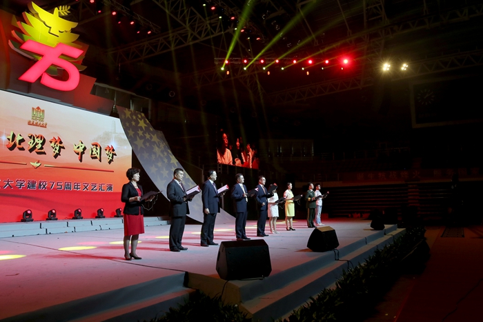 会后,返校校友、现场来宾以及师生员工代表共同观看了75周年校庆文艺演出。演出以“北理情 北理梦 中国梦”为主题,分为“科技北理”、“风采北理”、“底蕴北理”三个篇章,精彩地展示了我校的军工特色、辉煌历史和文化底蕴。校友们积极踊跃参加了文艺汇演,长三角地区校友代表带来了歌曲联唱,历届京工演讲团成员朗诵了《战争与和平》、茸芭莘那校友表演了独唱。演出结束后,校领导、各部门、各学院负责同志和校友代表一同上台与参演人员合影留念。