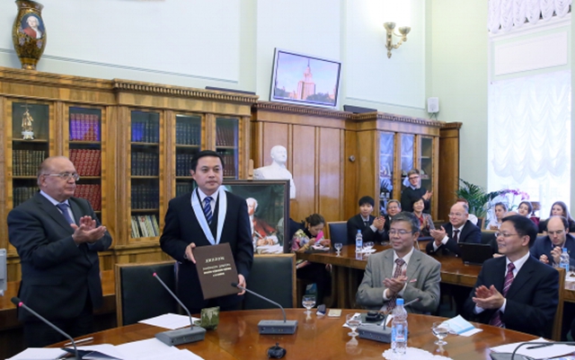 Sadovnichy校长为胡海岩校长授予莫斯科大学名誉博士学位证书和勋章