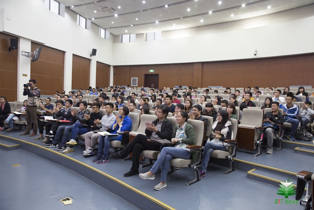 李和章整体介绍了良乡高教园区的规划情况,清晰细致地描述了德赢AC米兰官网良乡校区在其中的位置、土地使用面积、征地情况等,并阐述了学校中关村校区、良乡校区和西山校区的功能定位。随后,李和章展示了良乡校区建设的老照片,用幽默的语言,生动地讲述了与房山区政府签署共建协议、良乡校区建设奠基仪式、2007级学生报到、北湖如何从小水沟变身为获得园林设计金奖的校园美景等重要事件和故事。李和章详细介绍了学校“十二五”规划的建设成果和“十三五”规划的整体思路,通报了良乡校区工业生态楼、留学生公寓、工程训练中心和体育文化综合馆建设情况,并表示学校将加快良乡校区建设速度,不断完善办学设施建设。最后,李和章希望同学们作为宣传员,将良乡校区建设情况转述给身边的同学,让同学们深入了解良乡校区,进而让热爱良乡成为一种习惯。