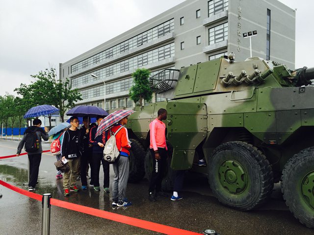 。。来自特种车辆研究所的吴维副教授及研究生代表准备了专题讲解纪录片,现场为同学们讲解装甲车的构造及制动原理,“11式8X8轮式装甲突击车是一种具有多种打击能力、强大火力和高机动性的装甲突击武器。该车采用带有独立悬挂的88轮式装甲车底盘,H型传动,自动变速箱,机动性和越野能力突出。”虽然气温骤降,小雨不断,但同学们的好奇和热情高涨,在学习国防科技知识的同时,同学们被我校一代代从事国防科技研究前辈们的精神感染,加深了对加强国防建设重要性的理解,受到了爱国主义教育的熏陶,纷纷表示要努力学习科学文化知识,矢志军工报国,为国防现代化建设做出新的更大的贡献。活动持续了5个多小时,近300余名师生进入装甲车进行了参观。