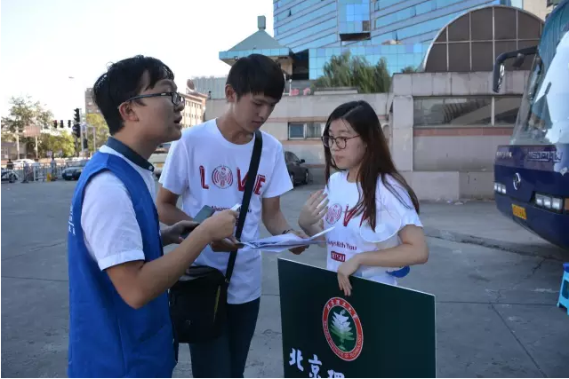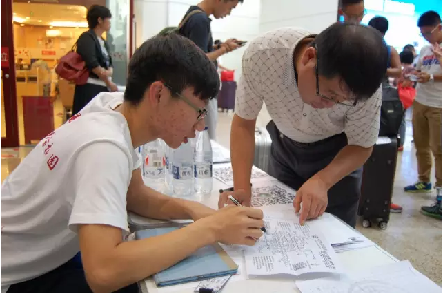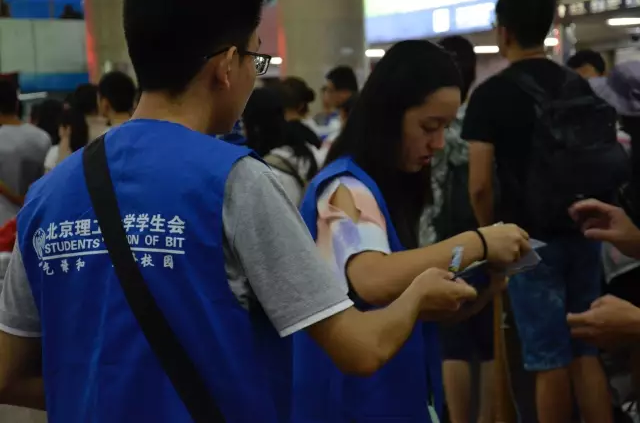 ▲北京站,几位志愿者围在一起,制定新生和家长的乘车计划。为了保证有秩序的发车将报到的新生送回良乡,志愿者之间少不了一番周密的安排和筹备。